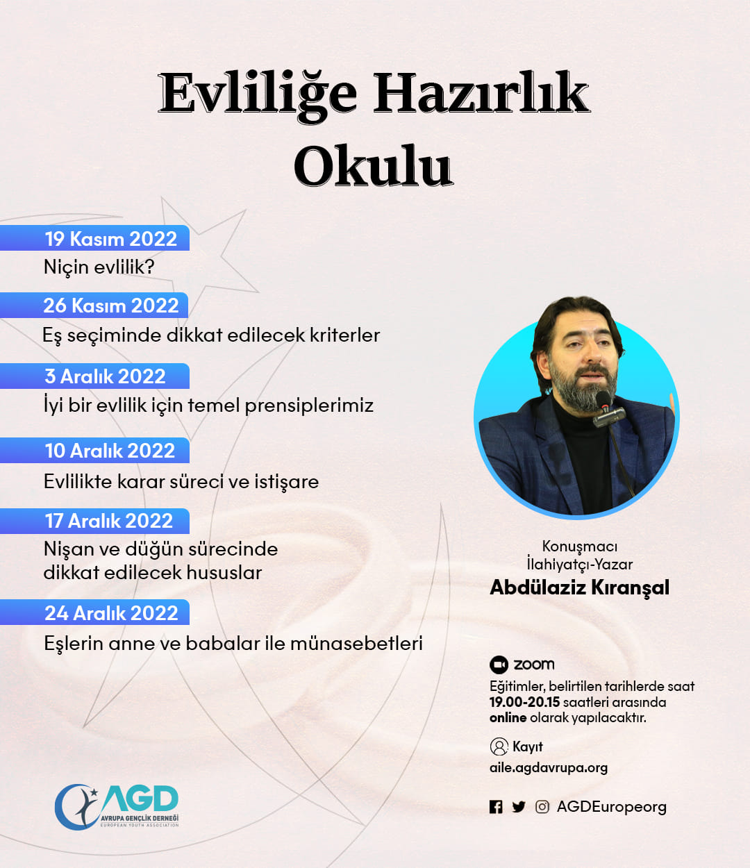 Bu eğitim programına dahil olmak için https://aile.agdavrupa.org adresinden ön kayıt yapılması gerekmektedir.